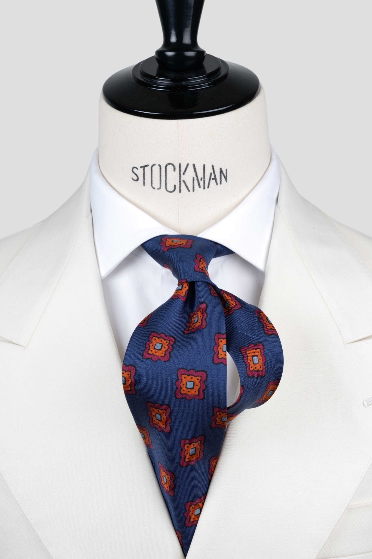 Cravate 7 plis bleu marine – Soie imprimée madder – fait main en Italie