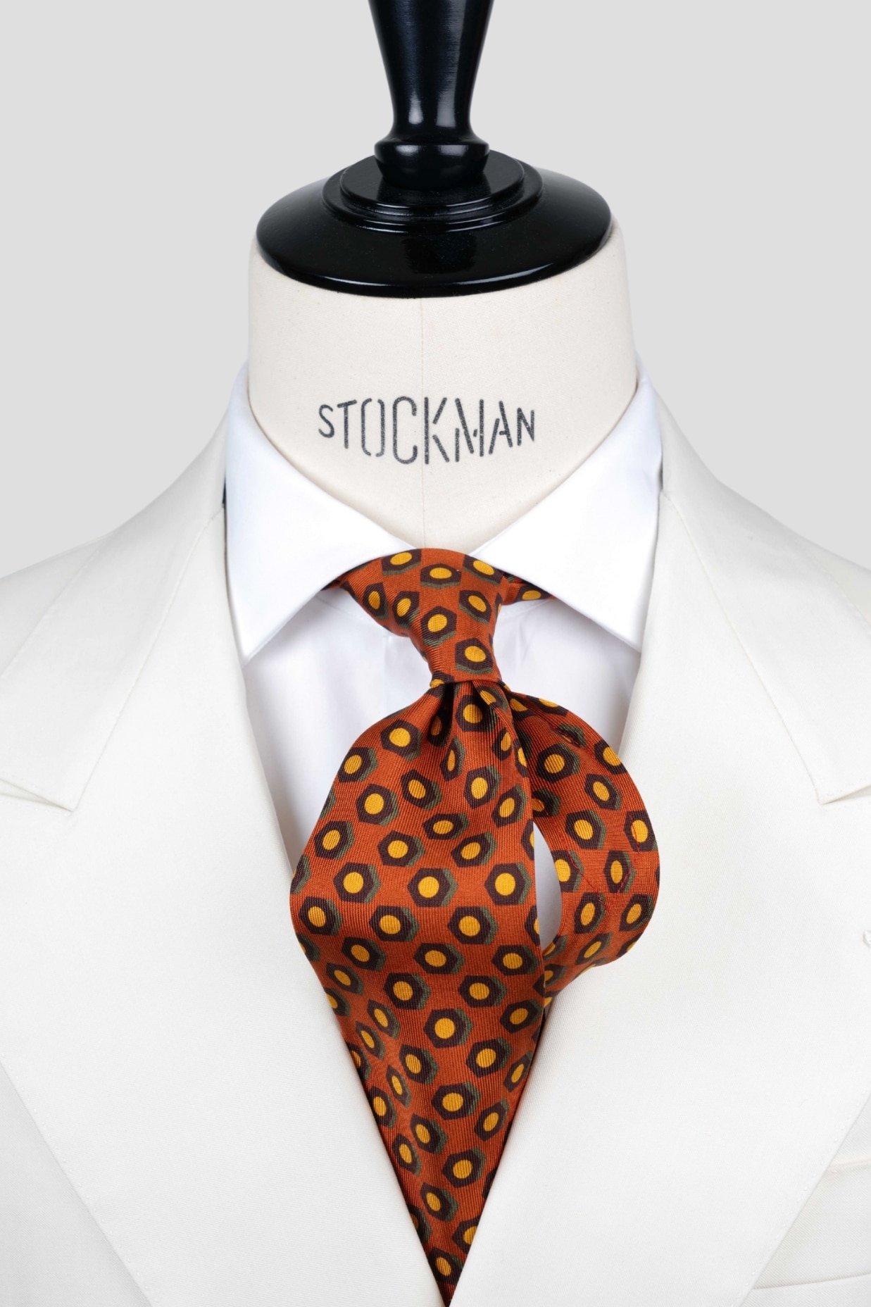 Pour la présentation ci-dessus, nous avons opté pour le nœud simple. La densité de la soie étant importante, nous déconseillons l'usage du nœud double (Windsor). Étant d'ordinaire un très gros noeud consommant beaucoup de tissus, il est par définition très épais. Selon nous, combiner les deux donne un rendu trop épais et peu esthétique. Le demi-Windsor, proche du nœud simple en rendu visuel, est quand à lui envisageable !
