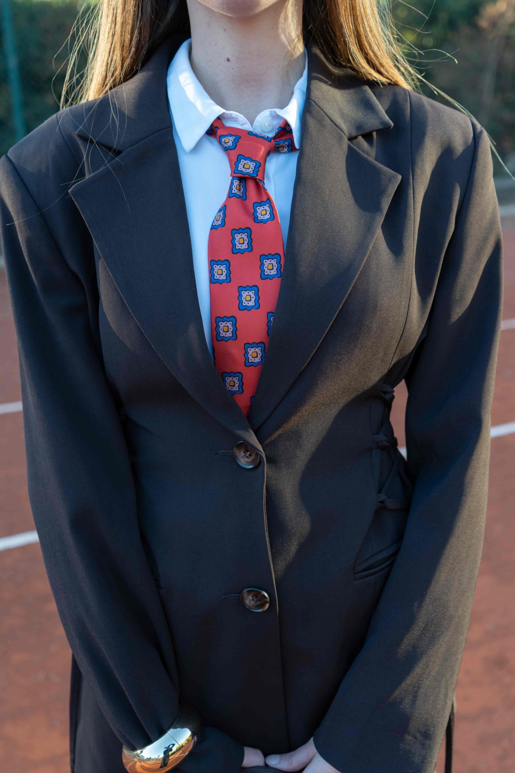 Pour la présentation ci-dessus, nous avons ainsi opté pour le noeud simple. Toutefois, la densité de la soie étant importante, nous déconseillons l’usage du noeud double (ou Windsor). En effet, ce noeud est généralement très volumineux et consomme beaucoup de tissu. Par conséquent, il devient particulièrement épais. Selon nous, combiner les deux donne alors un rendu trop massif et peu esthétique. En revanche, le demi Windsor, visuellement proche du noeud simple, reste envisageable.