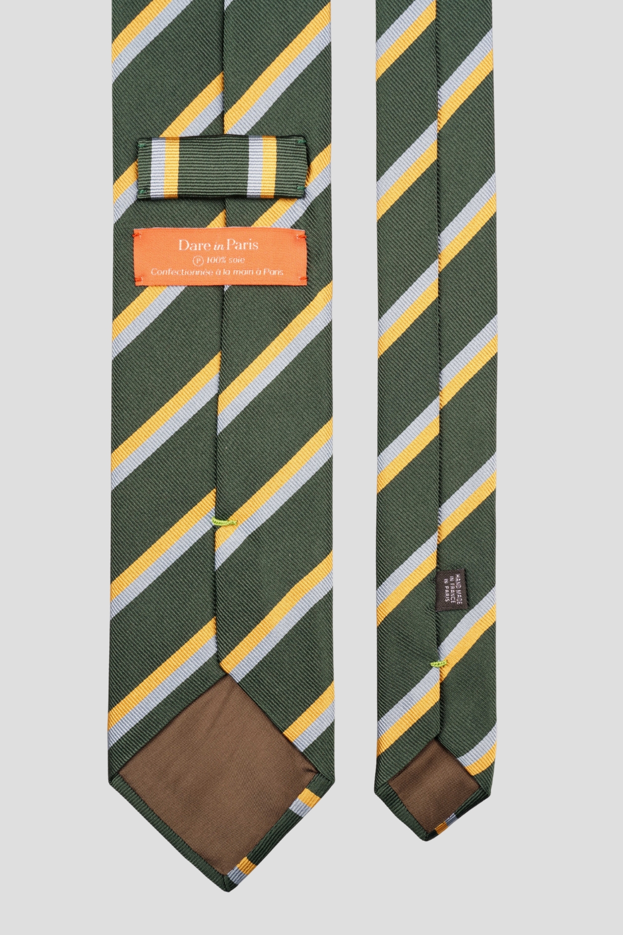 Nous entoilons votre cravate verte rayures sur toute sa longueur pour lui assurer son maintien.